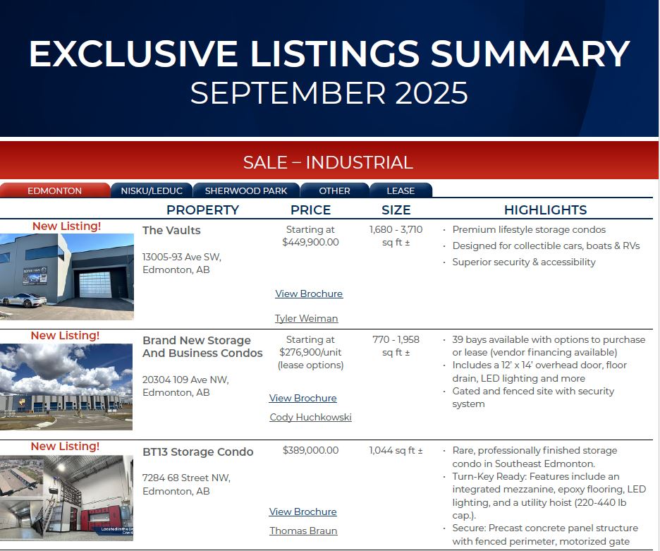 Our exclusive listing summaries compile all our properties into one document categorized by asset type and availability. To learn about each summary, click on the respective asset types below.